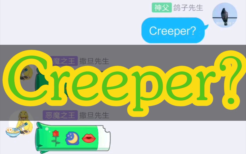 Creeper,网络流行词。Creeper原本指游戏《我的世界》里的一种生物“爬行者”,后因2019年7月8日网友king在YouTube上与朋友在Discord上用打字接龙的方式唱出《Revenge》这首改编歌曲,在网络上成为流行的梗。